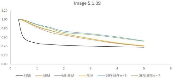 The GEFS–SEFS measures are more robust to noise than the PSSNR, SSIM, MS-SSIM, and FSIM indices, slowly decreasing with respect to the other image similarity indices. Figure 6 shows the trends for σ varying between 0.3 and 5.