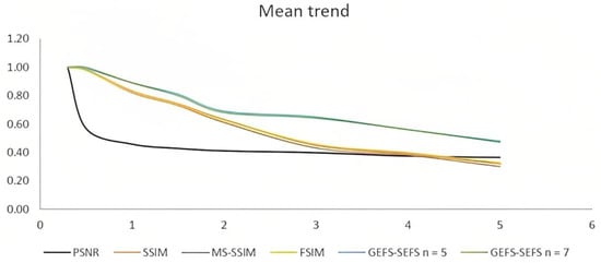 Figure 6 shows that the trend of the two GEFS–SEFS indices slowly decrease with respect to the similarity indices; moreover, the two GEFS–SEFS measures have the same trend; this confirms that the proposed similarity index is independent of the choice of block sizes. Figure 7 shows the trend of the mean values of the similarity indices obtained for all the images.