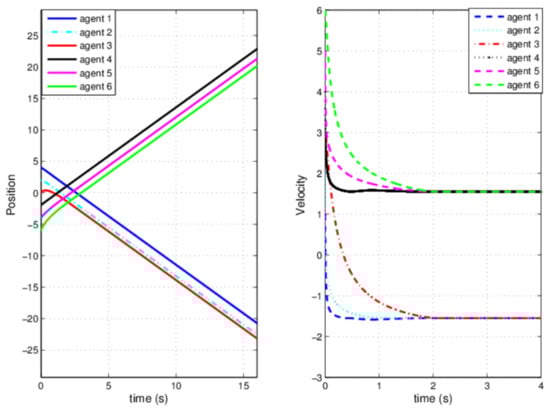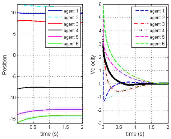 The structure of balanced graph can be described by the weighted adjacency matrix A; thus, the structure of graph is Figure 1. The protocol parameters are chosen as , , , . Preassigned times are chosen as and . The initial state is chosen as , , which are same as parameters as in [6,7,22]. The associated numerical results are shown in Figure 2 and Figure 3, and the bipartite flocking consensus is realized in preassigned time . The diameters corresponding to and are about 2.1 and 2.7, respectively. The initial state is chosen as , , and the diameter is about 6.15. The control signal is shown in Figure 4, which illustrates that the control protocol is distributed as well. This simulation supports our theoretical results well, that is to say, the figure verified effectiveness of the protocol (3). Figure 5 corresponds to unstructured balanced graph. It is obvious that a bipartite flocking consensus is not realized.