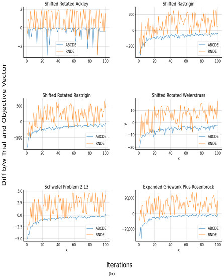 Of all the 13 benchmarks, ABCDE performed best in the Shifted Rotated Expanded Scaffer’s F6 benchmark function, significantly outperforming its counterparts. Compared to its nearest competitor, DE/Best/1, ABCDE achieved an average of 4.48E+15, with a standard deviation of 8.47E+15. Figure 2a,b show the yielded improvement in each iteration for different unimodal and multimodal benchmarks, respectively. The common thing among all is a gradual and rapid decrease between the generated trial vector and the existing target vector. The behavior of ABCDE remained consistent throughout the 100 iterations, and achieved optimal convergence for all benchmark functions.