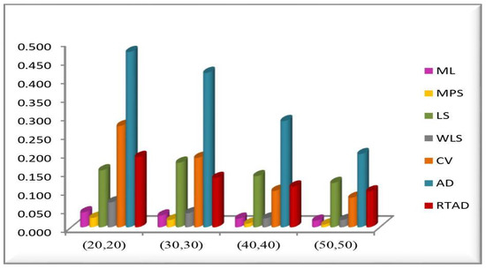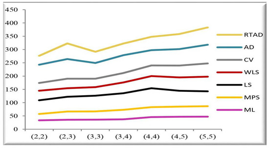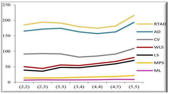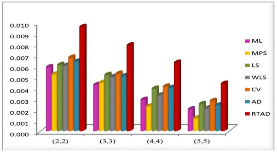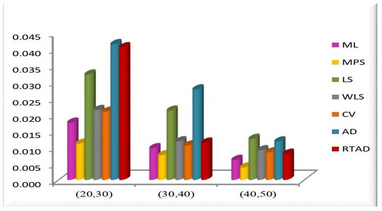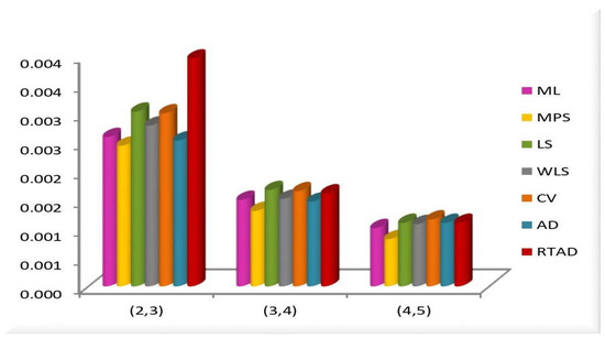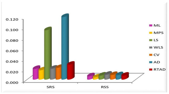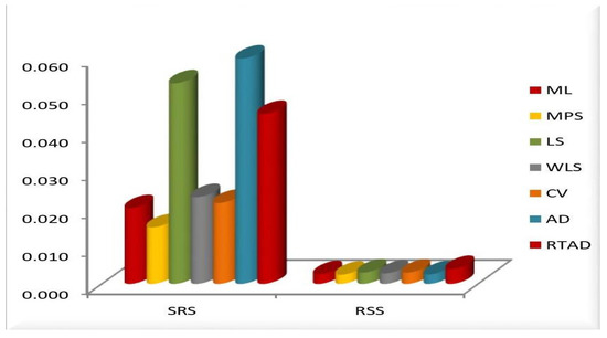 - Different estimation techniques, along with the selected sample scheme, were used to determine the MLE, MPSE, LSE, WLSE, CVE, ADE, and RTADE, namely, , , based on the RSS, and , , , , , , based on the SRS.
