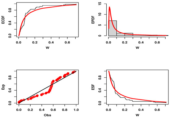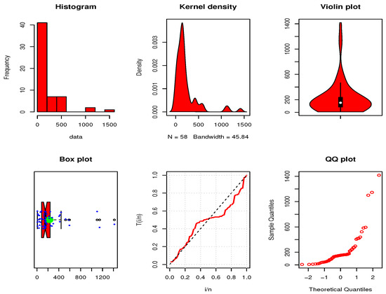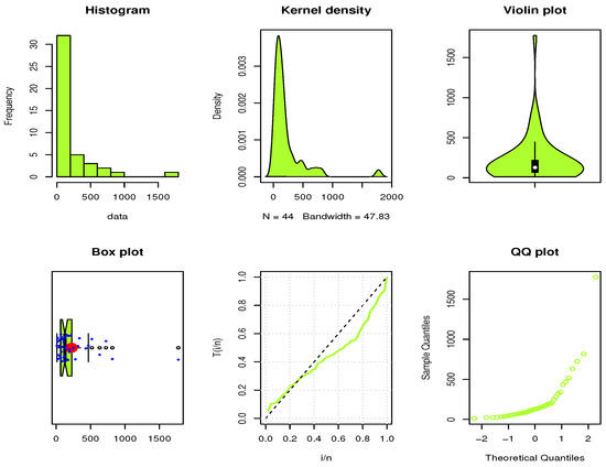 The initial PDF shapes are reported utilizing the non-parametric kernel density estimation approach in Figure 10 and Figure 11 for both data sets. From Figure 10 and Figure 11, we can see that the shape of the PDF is asymmetric for both data sets. The normality condition is checked via the QQ plot; see Figure 10 and Figure 11. The outliers can also be spotted using the box plot; see Figure 10 and Figure 11. Henceforth, we can say that there are outliers in both data sets. Figure 12 and Figure 13 display the estimated CDF (ECDF), estimated PDF (EPDF), PP—plots, and estimated survival function (ESF) for the UGD. Thanks to its asymmetric properties, the UGD is an appropriate model for fitting these data.