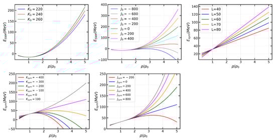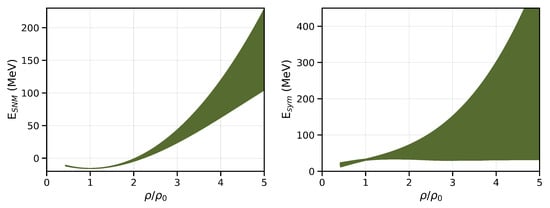 The nucleonic component of the EOS can be described by two quantities: the binding energy of symmetric nuclear matter, , and the symmetry energy, (see Equation (1)). These two quantities can be expanded as Taylor series around as: