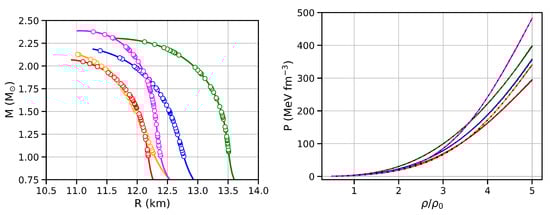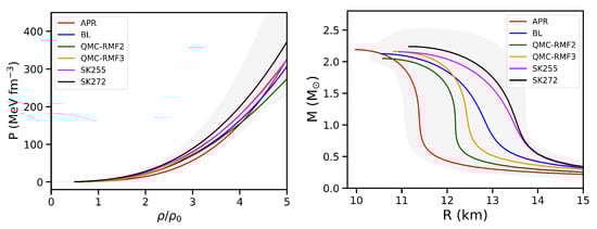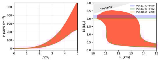 (Left window) Range of the equation of state (EOS) incorporating all constraints: Total pressure P as a function of the reduced density . (Right window) Range of mass–radius relation: Corresponding sequences of theneutron star (NS) models computed with the EOSs considered in this study. The mass ranges of the three heaviest pulsars known at present [82,83,84] are indicated in the right window.