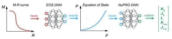 We used two DNNs that have similar architectures to accomplish two different tasks: extracting the EOS of dense neutron-rich matter from a set of mass-radius neutron-star measurements and inferring specific nuclear matter properties from the resulting NS EOS in -equilibrium. We refer to the first neural network EOS DNN (equation of state deep neural network) and the second one NuPRO DNN (nuclear properties deep neural network). Figure 4 provides a schematic representation of the procedure of using these DNNs to extract the EOS and selected nuclear matter properties.