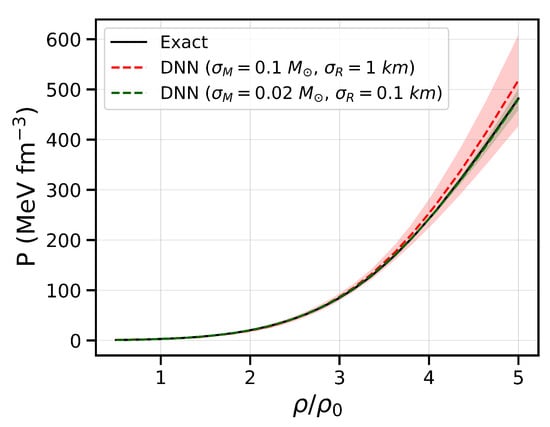 Example equation of state (EOS) predictions of the trained deep neural network model illustrating the effect of observational uncertainties included in the test dataset (simulated measurements with errors). The broken green and red lines represent the mean of the extracted EOS for smaller and larger measurement errors respectively, while the greenish and reddish shaded bands denote the corresponding mean absolute errors. The magnitude of the errors introduced in the input measurements is controlled by the values of and defining the normal distributions from which M and R are drawn. Specifically, to model smaller uncertainties, we choose M and km. Similarly, to model larger uncertainties, we choose M and km. The solid black line denotes the ground-truth EOS. See text for details.