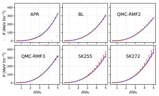 To test further the performance of the trained EOS DNN model, we apply it to several realistic EOSs from the CompOSE repository [154] (https://compose.obspm.fr (accessed on 25 March 2023)). CompOSE is an online tool that provides data tables containing state-of-the-art EOSs that can be readily used for various applications in astrophysics and nuclear physics. For the purpose of our analysis, we chose several EOSs within the range of the parameter space of the DNN training dataset: APR [134], BL [155], QMC-RMF2 [156], QMC-RMF3, [156], SK255 [157], and SK272 [157]. We generated the required input data following the procedure outlined in Section 2.3.1. For each EOS (Figure 7, left window), we calculated the relation (Figure 7, right window), and then drew random ensembles of 50 points to determine the mean and MAE of the reconstructed EOSs. The results of this test are shown in Figure 8 and demonstrate the ability of the EOS DNN to reconstruct realistic EOSs from data. In all frames, the solid blue lines denote the ground-truth EOS and the red dot characters represent the mean of the DNN predictions respectively. The error bars represent the MAE with which the EOS is reconstructed in each case due to the random drawing of the data, and in order to clearly separate the error contribution of this effect alone, they do not include the effect of assumed observational uncertainties. Among the realistic EOSs we considered, it is seen that the predicted relation matches almost exactly the ground-truth values for the APR, BL, QMC-RMF2 and QMC-RMF3 models, while the the SK255 and SK272 EOSs are reconstructed less accurately, but still within the reconstruction errors.