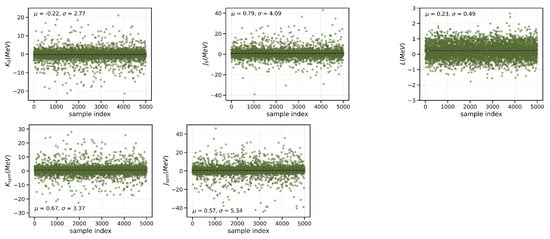 Residuals of the model for each of the selected nuclear matter parameters along with the numerical values for the mean, , and standard deviation, . As observed, for the lower-order parameters ( and L), the mean values of the residuals are less than 0.5 MeV (with MeV for both cases). Additionally, it can be seen that the standard deviation is comparatively smaller for the lower-order parameters. This can be attributed to the fact that the range of possible values for the lower order parameters is smaller, resulting in better interpolation precision. On the other hand, the higher-order parameters exhibit larger values of , owing to the larger range of possible values. For further information, refer to the text.