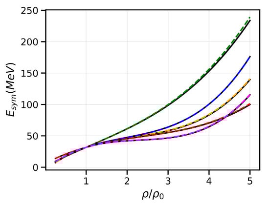 Reconstructed from the -equilibrium neutron-star equation of sate, , for several representative samples from our training dataset. The black solid curves represent the ground-truth symmetry energy and the broken colored lines denote the deep neural network predictions respectively. The predicted symmetry energy is obtained through Equation (3) with the parameters L, and estimated by the trained NuPRO DNN (nuclear matter properties deep neural network) model.