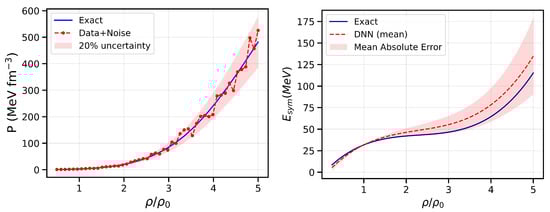 (Left window) Equation of sate (EOS) data sample, , with added 20% uncertainty. The ground-truth equation of state, , is represented by the blue solid line, while the red dashed line shows an instance of data with random noise added within the range of uncertainty. The uncertainty of the input equation of state is illustrated by the reddish band. (Right window) Estimated nuclear symmetry energy, . The precise value of nuclear symmetry energy is indicated by the blue solid line, while the red dashed line represents the average value of the derived , and the reddish colored band indicates the mean absolute error (MAE). The calculation of is performed using Equation (3) with the nuclear matter parameters L, , and extracted through NuPRO DNN (nuclear matter properties deep neural network). Further information can be found in the text.