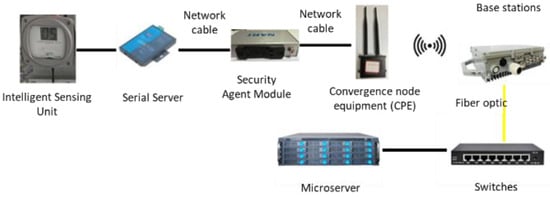 In the 110 kV GIS intelligent substation network mode, as shown in Figure 1 below, the wireless sensor unit transmits the perceived data to the host through the wireless mode. After the host receives the information perceived by the wireless sensor unit, the data is uploaded to the serial port server by the wired way. The serial port server sends the data to the security agent module through the Ethernet cable for the data security processing, then the security agent module sends the processed data to the Customer Premise Equipment (CPE) via Ethernet cable, and the CPE uploads the processed data to the base station via wireless mode. Finally, the data is uploaded to the terminal server by the optical fiber from the base station. This kind of network is relatively complex, using lots of equipment, and there are also many types and quantities of cables used.