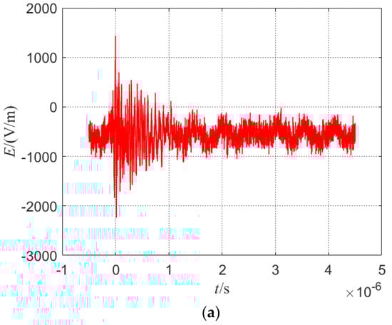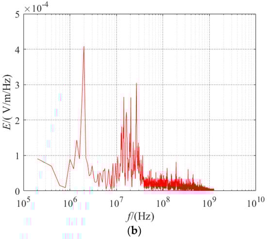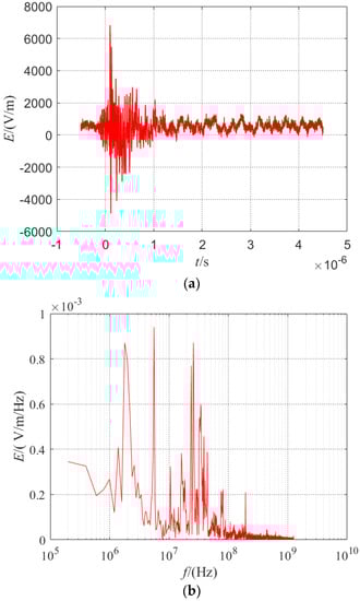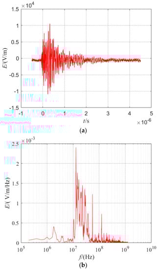 Transient electric field waveform generated by circuit breaker operation. (a) Time domain waveform. (b) Frequency domain waveform.