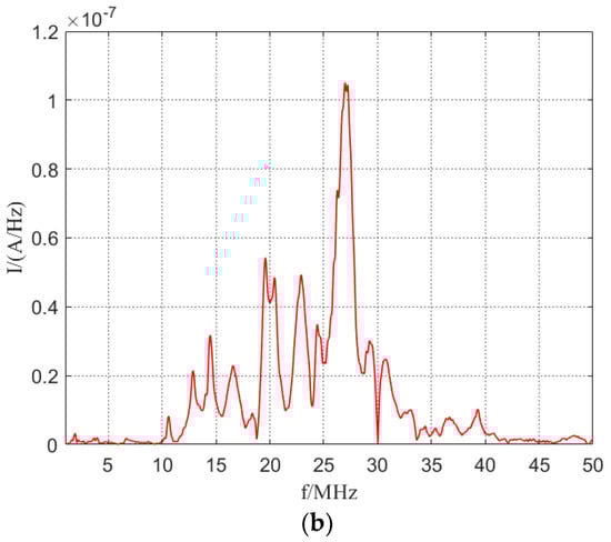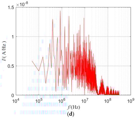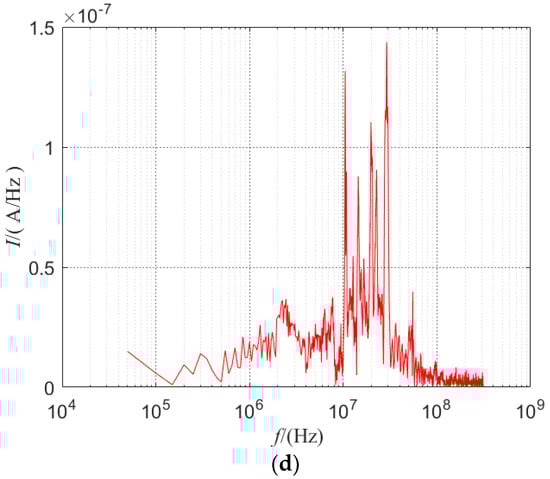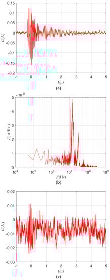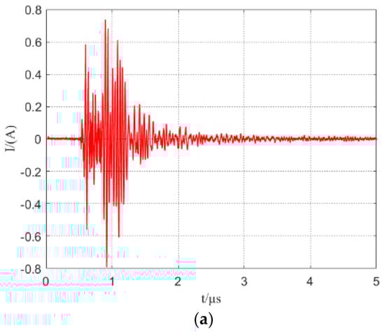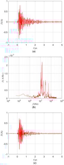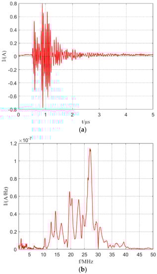 When the 110 kV GIS intelligent substation is engaged in busbar-side isolating switch closing operation, lineside isolating switch operation and circuit breaker operation, the common-mode induced current data of the communication line and power line of the sink node are obtained. Figure 8 and Figure 9 show the time-domain and frequency-domain waveforms of the common-mode induced current of the sink node cables during the isolation switch closing operation, corresponding to the transient space electric field of the operation type in Figure 5 and Figure 6, respectively. Thus, the induced current of the cable in the sink node under near-field excitation is obtained.