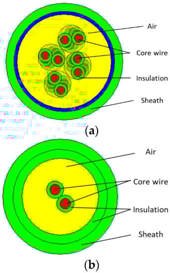 Schematic diagram of sink node cable structure model. (a) YD/T1019-2013 standard cable model. (b) ZRRV power line model.