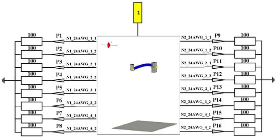 The measured space electric field is introduced into the antenna port of the near-field-line coupling model to simulate the coupling characteristics of the sink node cables in the near-field space. After setting up the excitation source and near-field-line coupling model, the corresponding field-line coupling equivalent circuit model is generated in CST software, and the probe is set up, as shown in Figure 12 below.