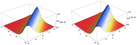 The surface plots of solitons (57) and (58) are depicted in Figure 1. The parameter values chosen are: , , , , , , , , , −1 and . The surface plot of a bright soliton is a smooth, bell-shaped curve that remains relatively constant over time and space. The curve is localized in space and time, and its height corresponds to the amplitude of the soliton, while the x-coordinate represents the spatial dimension, and the t-coordinate represents time. Bright solitons are known for their ability to maintain their shape and amplitude over long distances, due to a balance between dispersion and nonlinearity. This stability means that the surface plot of a bright soliton shows only minor fluctuations or deformations, which reflects the regular and predictable behavior of the soliton. The symmetrical nature of the surface plot indicates the stability and regularity of the soliton. These properties make bright solitons ideal for use in applications such as fiber optic communications or Bose-Einstein condensates in ultracold atomic gases, where stability and control are crucial. The surface plot of a bright soliton is a visual representation of a stable and localized wave phenomenon that can propagate over long distances without losing its shape or amplitude.