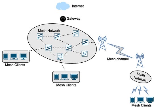Mobile ad hoc networks (MANET) [1] support or enhance next-generation networks for applications including but not limited to the Internet of Things (IoT) [2], Industrial IoT [3], massive IoT [4], fifth-generation (5G) cellular network [5,6], and software-defined networks [7]. Almost all of the currently available routing protocols for ad hoc networks already support most of the mentioned network types, with or without modifications to better suit individual applications [8,9,10]. Apart from Media Access Layer (MAC) optimizations [11,12], the type of routing protocol selected (proactive or reactive) affects the performance and reliability of the whole network and the ability to deliver or drop the packets for unknown networks successfully [13]. Several symmetric and asymmetric cryptography techniques provides security in MANETs [14]. BATMAN [15] (Better Approach To Mobile Ad Hoc Networking) was introduced with limited functionality, after which several updates were made to provide better flexibility and convenience for network engineers to set up and maintain mesh networks and adapted to wide array of networks such as IEEE 802.11s as shown in Figure 1.
