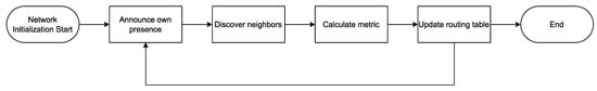 The very first step will be to announce the presence of the self to every neighbor using a customized message OGM after the initialization of the BATMAN protocol. This message will be broadcasted with the parameter time-to-live (TTL) equal to 1, ensuring that it only reaches direct neighbors and is not forwarded to other nodes. This message will continue being broadcast with a delay of 1 s by default (originator interval) until the algorithm is taken offline or the node is powered off. Each OGM is marked with a sequence number (SN), which helps in eliminating any received obsolete information. The SN also helps prevent any routing loops from forming as any packet re-broadcasted to the originator node can verify that it is the same information it broadcasted earlier, eliminating some of the causes of routing loops. The metric used by the protocol is termed Transmission Quality (TQ), which is calculated for each link toward the destination between neighbor nodes by analyzing the OGMs received by the neighbors. A similar transmission quality metric was also utilized, but based on geolocation [32]. A basic flowchart for BATMAN general components is presented in Figure 2.