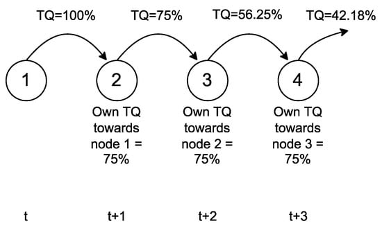 where is extracted from the OGM received from node 1. The TQ that will be forwarded to another neighbor in the direction of the path will be , which when received by node 3 will be termed as simply , while is the same as calculated in the previous section. Node 3 at time interval will compute the new using (2) and transmit the calculated TQ when sending OGM to other neighboring in the path. The same procedure will be repeated for all other consecutive nodes in the path until the destination is reached.