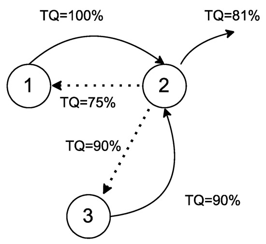 In such scenarios, where multiple paths lead to the destination, the best path metric would be identified by comparing the obtained from Equation (2) of two nodes. A similar case is presented in Figure 4, where node 1 and node 3 transmit their to node 2, and node 2 results as 75% and 81 for the paths from 1 and 3, respectively.