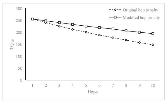 Experiments in [34] show that a hop penalty higher than 15 would have an overall impact on TQ, which will diminish the local link quality, and BATMAN as a routing protocol becomes a hop count rather than a composite metric. The variation in hop count also impacts the overall network throughput and delay performance. To better understand the impact of the hop penalty on the TQ, consider Figure 5, where 10 hop-to-hop nodes are presented in a serial fashion. All nodes have a TQ value of 255 (the maximum as per BATMAN specifications) and analytical results are plotted with the impact of increasing hop numbers. The figure shows that increasing hop decreases the overall TQ quality by 42% after 10 hops; therefore, networks with a higher number of hops suffer more as compared to networks with fewer hops. Another example of delay impact on the network where nodes are considered symmetric in nature is presented in [35]