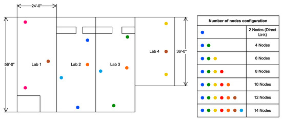 The experiment was conducted in a lab environment with consecutive labs in a corridor situated on the first floor in the Telecommunication Department of NED University of Engineering and Technology. The map of the experiment’s location is presented in Figure 8. It is important to note that there are several configurations where different numbers of nodes were deployed. Therefore, Figure 8 contains a legend that shows the configurations of nodes and placement in a tabular manner. The nodes were placed such that a smaller number of nodes cover the entire area provided for this experiment. After covering the entire lab area of 4896 sq ft. with only eight nodes, an additional number of nodes were placed in between the nodes, which caused multiple paths between source and destination with a relatively good transmission quality metric.