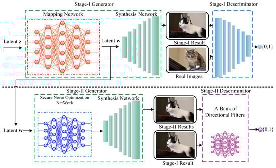 Since the effect of stochastic variation adjustment relies on the injected noise at each layer of synthesis network, due to the similar adding operation, we hypothesize that this noise-adding operation can be seen as another type of data embedding (steganography). Therefore, if the injecting noise is optimized, along with the image synthesis, we could obtain the proper images which own higher security. Motivated by the abovementioned works, this article proposes a noise-optimization stacked StyleGAN2 named NOStyle for secure steganographic cover generation. The proposed scheme aims to enhance the security and, meanwhile, keep the fidelity of generated image. As shown in Figure 1, the whole architecture of NOStyle is segmented into two stages with symmetrical mode. The structure of the first stage is the same as StyleGAN2 composed by a set of stage-I generator (SI-G) and stage-I discriminator (SI-D). The second stage also includes a pair of new stage-II generator (SII-G) and discriminator (SII-D). In Figure 1, we show the detailed framework.