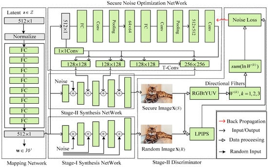 Consider the distinguishing characteristics of typical architecture StyleGAN2 and the demanding of security, the main goal of our proposed architecture is to enhance the security of generated image by optimizing the stochastic variation, while the fidelity of created image is kept as vivid as possible [27,28,29]. Unlike the previous works StyleGAN and StyleGAN2, the stochastic variation represented as noise map is not random and, based on the progressive growing and short connection [30,31,32], we design a secure noise optimization network (SNON) which aims to optimize the noise map. After optimization, we can obtain proper noise map which will be involved in the synthesis of the high-resolution and secure image. Apart from the network structure, the convergence of SNON relies on the output of SII-D in which we combine the predefined steganographic distortion function and learned perceptual image patch similarity (LPIPS) to construct the noise loss which is employed to evaluate the differences between the two results of SI-G and SII-G. Here, we hypothesis that, for image generation, the security and fidelity are two contradictory topics. Therefore, our proposed scheme is a strategy which tries to makes a tradeoff between the security and fidelity.