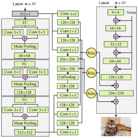Our noise optimization network is mainly inspired by PGGAN and ResNet [33,34,35]. Two simple designing rules are given to optimize the injecting noise: First, we introduce the progressive mechanism to generate the noise with the same size as the different resolution image. Second, the disentangled latent code is indirectly utilized to form the secure noise by shortcut connection. The progressive model is formed by three blocks in which there are a full connected layer, two convolution layers, and an average pooling layer with stride of 1. Each block aims to shift the low resolution to the high resolution. Therefore, after three times promoting, the latent code is changed into a feature map. Here, we want to adjust the injecting noise at two resolutions ( and ). Hence, we narrow the number of feature map into resolution with three convolution kernels and obtain three corresponding feature maps denoted as Rn1, Rn2, and Rn3, respectively.