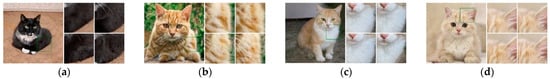 Macroscopic comparison of two methods. Four sub-figures (a–d) are generated by StyleGAN2 and NOStyle. Each sub-figure contains two images. The left one is an image generated by StyleGAN2 and the right image is created by NOStyle.