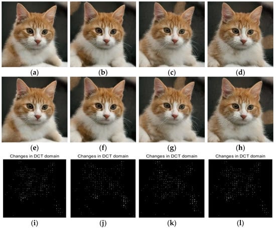 Illustrations of four cover images, stego images, and corresponding modification maps of J-UNIWARD at 0.2 bpnzAC for StyleGAN2, NOStyle-SLA, NOStyle-SLB, and NOStyle. (a–d) are cover images are generated by above mentioned four generative methods. (e–h) are corresponding stego images. (i–l) are the modification maps in JPEG domain.