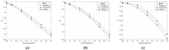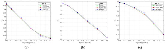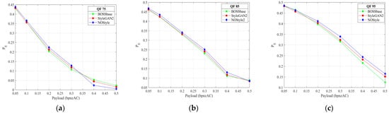 Detection performance comparison of BOSSbass, StyleGAN2, NOStyle-SLA, and NOStyle-SLB for detection UED with JRM for JPEG quality factors 75, 85, and 95. (a) Detection comparison for UED for 75. (b) Detection comparison for UED for 85. (c) Detection comparison for UED for 95.