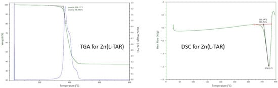 Thermal gravimetric analysis was conducted on TA instruments TGA analyzer under N2 up to 800 °C. The plot (Figure 2, left) showed a single weight loss from [Zn(L-TAR)] (formula weight 213.5 g/mol) in the region 350–450 °C (−62%). Residual mass of 38% fits for ZnO (formula weight 81.4 g/mol). DSC measurements were made from ambient to 400 °C under a nitrogen atmosphere on a Universal V4.5A TA Instrument (Waters). A heating rate of 10 °C per minute was employed, a single endotherm was found with onset at 355 °C and with minimum heat flow at 375 °C, corresponding to the decomposition found in the TGA analysis.