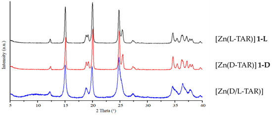 Powder X-ray diffractograms for [Zn(L-TAR)] 1-L, [Zn(D-TAR)] 1-D, and [Zn(D/L-TAR)].