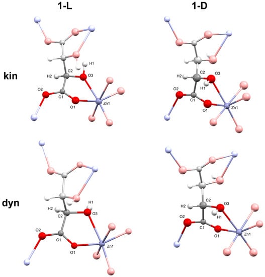 Expanded molecular structures for Zn(L-TAR) 1-L and Zn(D-TAR) 1-D (kin = kinematical refinement, dyn = dynamical refinement), symmetry equivalents are marked by pale print.