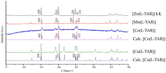 Powder X-ray diffractograms for 1-L and Mn, Co, and Cu metal tartrates [M(L-TAR)].