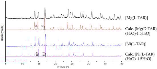 The powder X-ray diffractograms of [Mg(D-TAR)(H2O)·1.5H2O] and [Ni(L-TAR)(H2O)·1.5H2O] hydrates are calculated from the single crystal structures of JIFXIG [] and CIXKEZ02 [], respectively. The two Mg and Ni metal tartrate products match well with their corresponding calculated patterns, indicating that these two metals tend to form hydrates under 110 °C hydrothermal conditions.