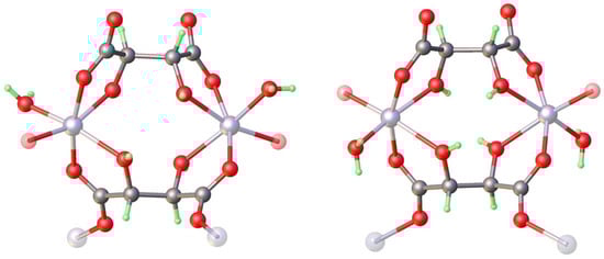 The next level of structural comparison for these MOFs is the structural building block SBU. This is best seen as a molecular dimer comprising two octahedral M2+ dications and two bridging µ2-tartrate-dianion ligands. In the anhydrous phase both tartrates are µ4 and provide six coordination sites for the metal. In the hydrated phases CUJBAK and KURNOB the two tartrates are chemically distinct with one µ4- and one µ2-tartrate. The keto oxygens of one ligand are not coordinated and the two vacated sites are occupied by coordinated aqua groups. The distinction between the two hydrated frameworks is that they are diastereomeric—the water and keto coordination are reversed as may be seen in Figure 7. It may also be pointed out that the octahedral metal centers are also chiral and the designation of Δ can be ascribed for L-tartrate networks and Λ for D-tartrate analogues.