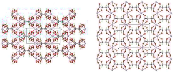 1-L and 1-D crystallize in the orthorhombic space group I222 with half a formula unit in the asymmetric unit (Table 2 and Table 3 and Figure 1 and Figure 4). They are isostructural to the reported Mn(II), Fe(II), Co(II), and Ni(II) tartrate coordination polymers, which are all based on naturally occurring L-tartrate []. Zn is coordinated by six O atoms in a distorted octahedral fashion with Zn-O distances between 2.00(2) Å and 2.36(4) Å. The longer Zn-O distances occur for the “backward” coordinating O of the carboxylate (see O1 in Figure 4) that chelates together with the hydroxy O forming a bite angle of 74.4(11)° to 75.8(7)° at the metal. The coordination sphere is completed by the same chelate motif of another tartrate molecule and two more carboxylate O atoms of different tartrates which coordinate in the common “forward” mode (see O2 in Figure 4). Thus, each Zn(II) ion is coordinated by four different tartrates and each tartrate is connected to four different Zn(II) ions forming a three-dimensional coordination polymer. The structure features no pores that could accommodate water or other solvent molecules and is essentially a ‘condensed’ phase.