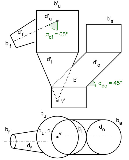 The model solution also shows , which is the intersection of the reference generatrix line with the − connection curve, and its highest point, , which will be used subsequently in the comparative analysis against the CAD model. These points were computed in the hopper projections, using the associated generatrix lines from and and transformed to the flat domain.