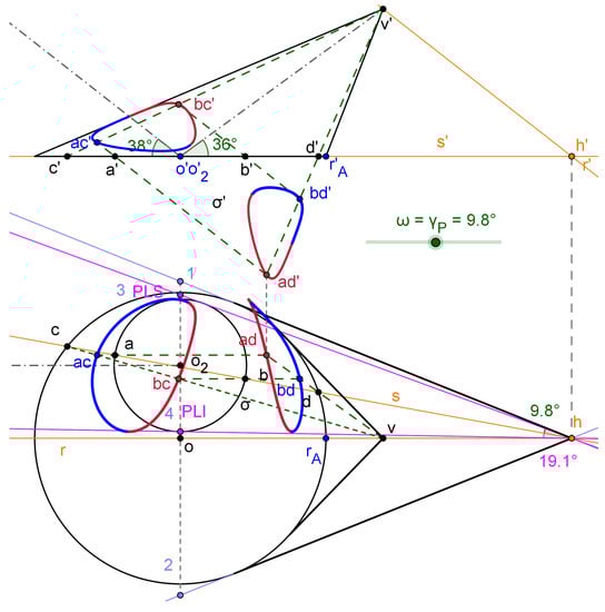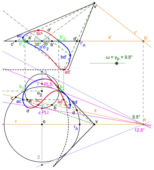 The generatrix line through intersects the sphere (radius equal to segment v’ − ) in − . Accordingly, pertains to the horizontal projection of the support curve , which is calculated through Equation (2) using in the circular base, defined between and . Therefore, the horizontal projection of between and is locus (, ) (orange horizontal projection).
