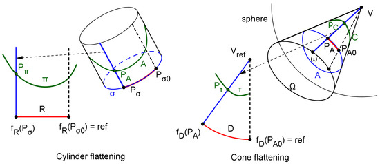 In the case of a cylinder (Figure 5–left), we must intersect it with a plane perpendicular to the axis, to give the section . The flat transformed of is the R straight line, perpendicular to transformed generatrix lines. We may use any generatrix line as a reference in the flat domain, as shown in Figure 5 (dashed line). Then, defining as a parameter, it is transformed to () onto R, ensuring the invariance of lengths of transformed paths. That is, the distance between () and () is equal to the length of between and . The flat transform of the generatrix line through is parallel to the reference one. The function converts its argument from into the transform in R.