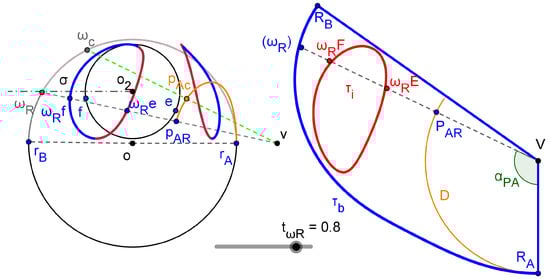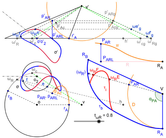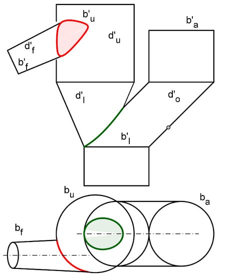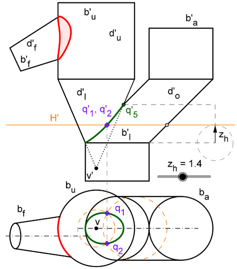 The intersection curve − is presented in Figure 9. It was calculated using a collection of horizontal planes with heights from the low border, , to the height of , as shown. In this manner, we define (pointed out in Figure 9) and . and are now circles that intersect in and (horizontal projection), and = (vertical projection), and thus the intersection curve is given by the parametric functions locus(, ) = locus(, ) (vertical projection, one leaf), and locus(, ) − locus(, ) (horizontal projection, two leaves).