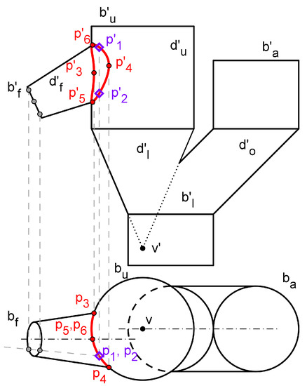 To illustrate this method, Figure 3 presents the computation of the intersection between an oblique cone with an oblique cylinder according to Equation (2). The surfaces are defined by their circular sections with a horizontal plane (bases) and their axis (and vertex v’ − v in the cone). The vertical contour of the cone has been added to facilitate the interpretation.