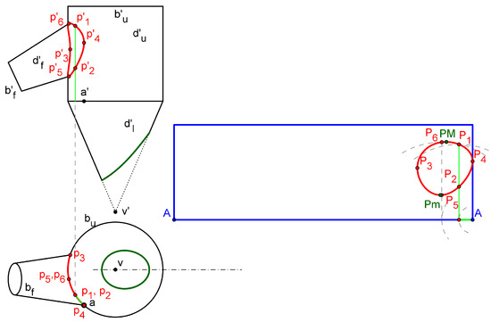 Cone surface intersecting with a cylinder (bite, Figure 3) flattened between generatrix lines through and . The projections of surfaces include auxiliary lines that help to follow the building process that gives the flat pattern (right–bottom).