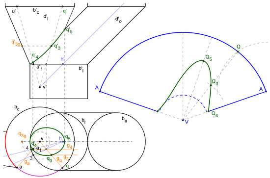The lower duct, , is a cone that is flattened according to Equation (6). The process is presented in Figure 11, including the final flat pattern (right). As is a revolution of a circular cone, we have selected the sphere that generates the cone border, − , as support curve . We use again the point A (a’ − a) to set the reference generatrix line, which facilitates the patterns’ junction. As is a flat curve, it may be also used as a plane section and then . Defining the point q (horizontal projection) from , it may be transported to the flat transformed of , D, keeping the length between its transform, Q, and A (reference) along D, as shown. The intersection of the generatrix line through q with the − connection curve is − , which is transported to the flat domain to deliver (keeping the distance V − ). Therefore, the − flat pattern is given by the parametric function .