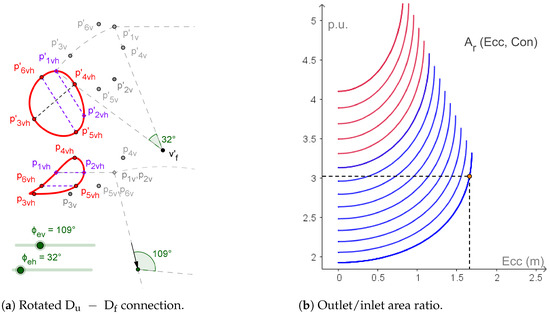 Visual inspection of the fluid duct connection (a) and numerical relation of its area section, , as a function of eccentricity (abscissa) and conicity (0.09–0.25 in blue, 0.27–0.35 in red, increments of 0.02) (b) in the CeDG model.