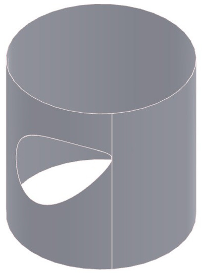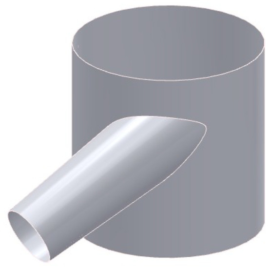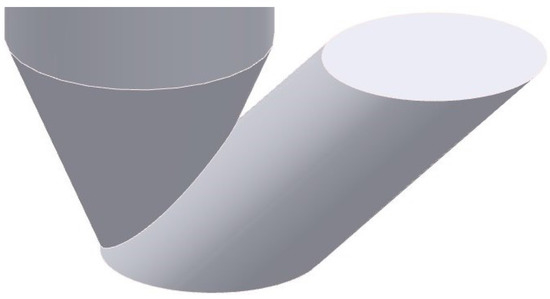 The intersection curve − is presented in Figure 17. As in the case of the preceding cylinder, both bodies were modeled with the Solid Edge 2023 solids module. The truncated straight cone was generated with the protrusion by the revolution command, whereas the oblique cylinder was created by using the protrusion sweep command. Then, a thickness of 0.0001 mm was applied.