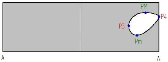 Figure 10 (right) also shows several relevant points within the intersection curve whose positions with respect to A are used to verify the accuracy of the flat transform. These areas and , with maximum and minimum height, and , associated with the curve’s boundary limits, and and (which are defined below), will be used to compute .