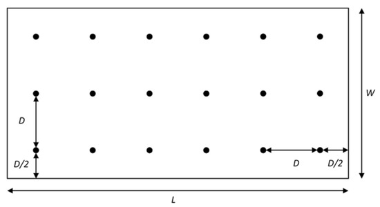 As for the base station (BS) layout, we refer to the typical deployment in 3GPP as shown in Figure 1. In this case, 18 BSs are distributed within a square lattice with spacing D, located D/2 from the walls. Here, we consider the small hall with L = 120 m, W = 60 m, and D = 20 m. Positioning devices are uniformly distributed over the convex hull of the horizontal BS deployment.